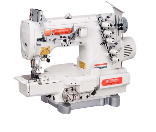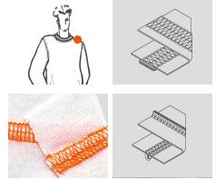 適宜中厚布料,經三線拷克車縫后再包縫,用于運動服、汗衫等領口、下擺、袖管等之拷邊車縫后加以包縫,可增加服飾之美觀及車縫之牢固,利用導布片及押具上之押刀導縫,可避免車縫時彎曲不直