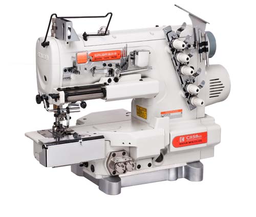 經由齒輪控制箱之控制,能有效控制松緊帶的長度與松緊度,可正確且平均的進行松緊帶縫紉,加附右切刀修布裝置氣動吸屑, 能于車縫前將布修齊,可增加縫製品質,如女用內衣褲之松緊帶或蕾絲松緊帶車縫