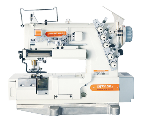 經由齒輪控制箱控制松緊帶的長度與松緊度,可正確且平均的進行松緊帶車縫,附右切刀修布裝置,更能提高車縫品質,適用于女內衣褲之松緊帶或蕾絲松緊帶車縫