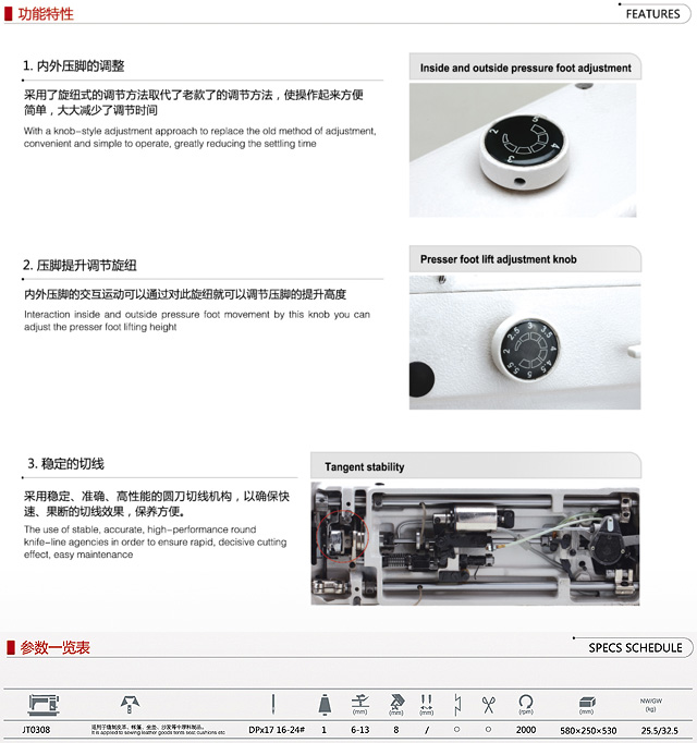 本機為平板式機體,大旋梭勾線自動潤滑系統,配置了自動煎線倒送料功能,然而代以往的手動倒回縫、剪線。提高了生產效率,工作起來更輕松、方便,特別適用于箱包、坐墊、沙發等皮革、帆布、織帶類物品縫制。