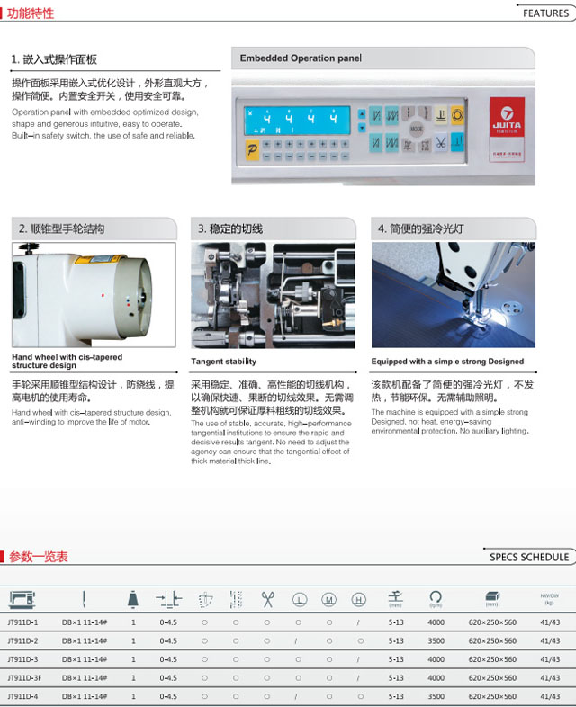 整機簡約平實,美觀大方,嵌入式人機互動界面,植入式安全開關,經久耐用表現穩定;切線系統表現優越,無需調整即可適應不同面料的相關工藝標準;強冷光操作照明,更多細節源于人性化環保配制。