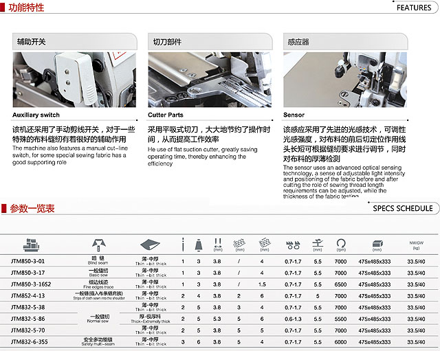 JTM800系列是改進的基本型包縫機,美麗的線跡和充實的附屬配件,維修方便,可廣泛滿足市場的需求;實現了控制溫度、噪聲、振動的高速旋轉,提高了生產效率;油封效果好,保護縫制品不受油污染。