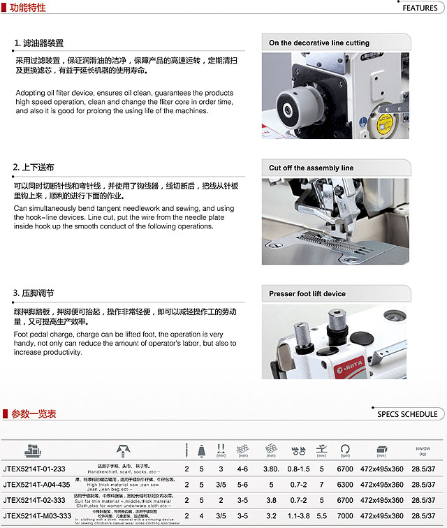 該機器廣泛適用于服裝、內衣、床上用品及薄型包裝盒皮革制品等各種面料的搭接縫、裝飾縫。另外還有多種線跡可供選著,JETX5214系列采用的是上下送布可獨立運作的新型送布機構,通過加大的差動比和優越的送布性能組合,可消除縫制錯位,或者與其他面料一起縫制,使曲折、滾動等難工序變得簡單易行。
