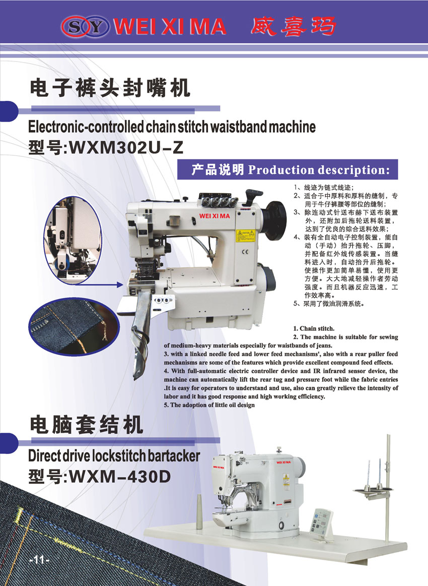 熱門產(chǎn)品: WXM1010G-V2 “威喜瑪”牛仔褲自動(dòng)貼皮牌機(jī)   WXM 2516G-LV8 “威喜瑪”雙針雙色花樣機(jī)(手袋廠專用)   WXM2516G-V8F “威喜瑪”牛仔褲自動(dòng)雙針雙色裝袋機(jī)(貼袋機(jī))   威喜瑪(WXM-2516G-V6)牛仔褲單針自動(dòng)貼后袋機(jī)(裝袋機(jī))   WXM1010G-V3F 威喜瑪牛仔褲自動(dòng)鈕牌(門襟)機(jī)