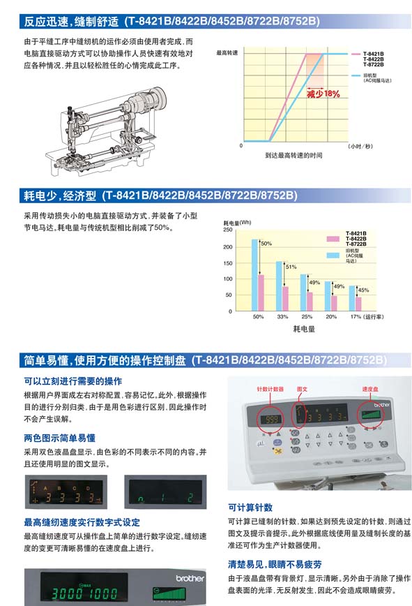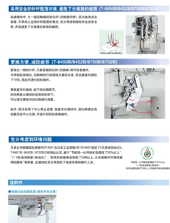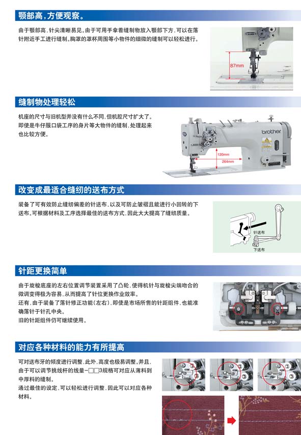 · 抬高了臂下深的位置,加大了機腔尺寸,縫紉物更容易周轉。 · 易于變更針距。 最小供油方式 用于薄·中厚面料/厚面料 最高縫紉速度:3,000 rpm 最大針距:5 mm 抬壓腳高度:7 mm 針送布/下送布為標準裝備