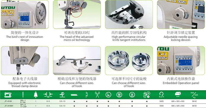 本機采用先進的一體式電腦控制技術,使用內置式伺服電機直接驅動,采用圓刀設計技術,具有低振動、低噪音、低耗油等優點,具有高效率、低耗電、更安全等優勢。優異的一體化設計,安裝操作簡易,運轉舒暢,縫制美觀,加大了操作空間,具有自動定針位、自動定針數、自動剪線、自動倒回縫、自動抬壓腳(選裝)、自動散熱等所有功能,適應不同面料的生產。