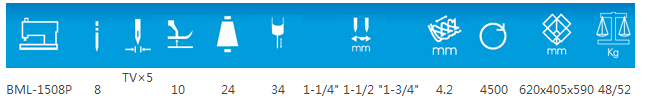 附加裝置: 1508PR:后拖輪的下輪左右分開,便于轉彎縫(4針) 1503PTF:帶后拖輪,特殊壓腳(3針) 1502L: 2針滾條MD-1:前送松緊帶裝置