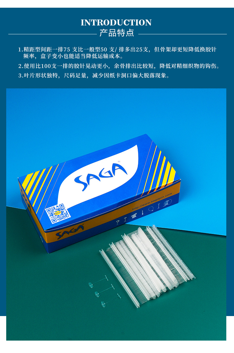 1、比50發/排膠針多25發而骨架長度更短,換膠針頻率降低。相對于精距100發/排膠針,SAGA PIN能減少操作時膠針骨架的晃動,同理降低對織物的損傷。