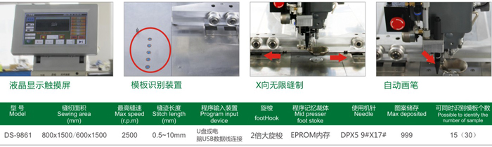 前所未有的降低了工人的技術要求,任何一個工人不用經過任何培訓即可操作機器,并生產出合格的產品。有效的提高生產效率,一鍵式操作,操作工人只要按一下啟動按鈕機器會自動運行,工人就可以準備其他的模板了,更由于加入自動模板識別系統,可同時加工顏色一樣的多塊不同的模板,又有上下點號筆為下一道生產工序進行加工準備,使效率提高到極致。很大程度提升了產品品質,由于使用程序化加工,可以保證所有產品針距和縫紉走向等做到標準一致,并可輕松的實現特殊要求,如對于衣物的轉角處加密縫制,或對有的部位進行雙刀縫制等,只需在編制程序時加入就可一步到位,對于特殊工藝要求的產品更是得心應手。