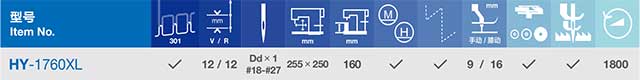 HY-1760L改進機型,具有該機型的全部功能。使用了直徑為37mm的超大旋梭,可縫制8*2織帶線。針距可達12mm。取掉一只機針,可作單針使用,無論縫制效果和效率都非常理想。與傳統的粗線雙針比較具有縫制速度快,操作輕松等優點。