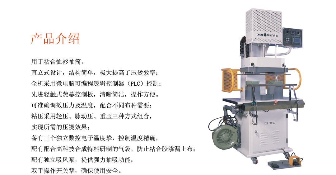 熱門產(chǎn)品: CF-128A 高速自動拼接橡筋機   CF-126B 全自動橡筋切帶機   CF-120H 全自動切斷機(熱刀)   CF—8133 全自動(襯衣)恤衫筒粘合壓平機   CF-600FP 氣壓式雙壓棍熱熔粘合機