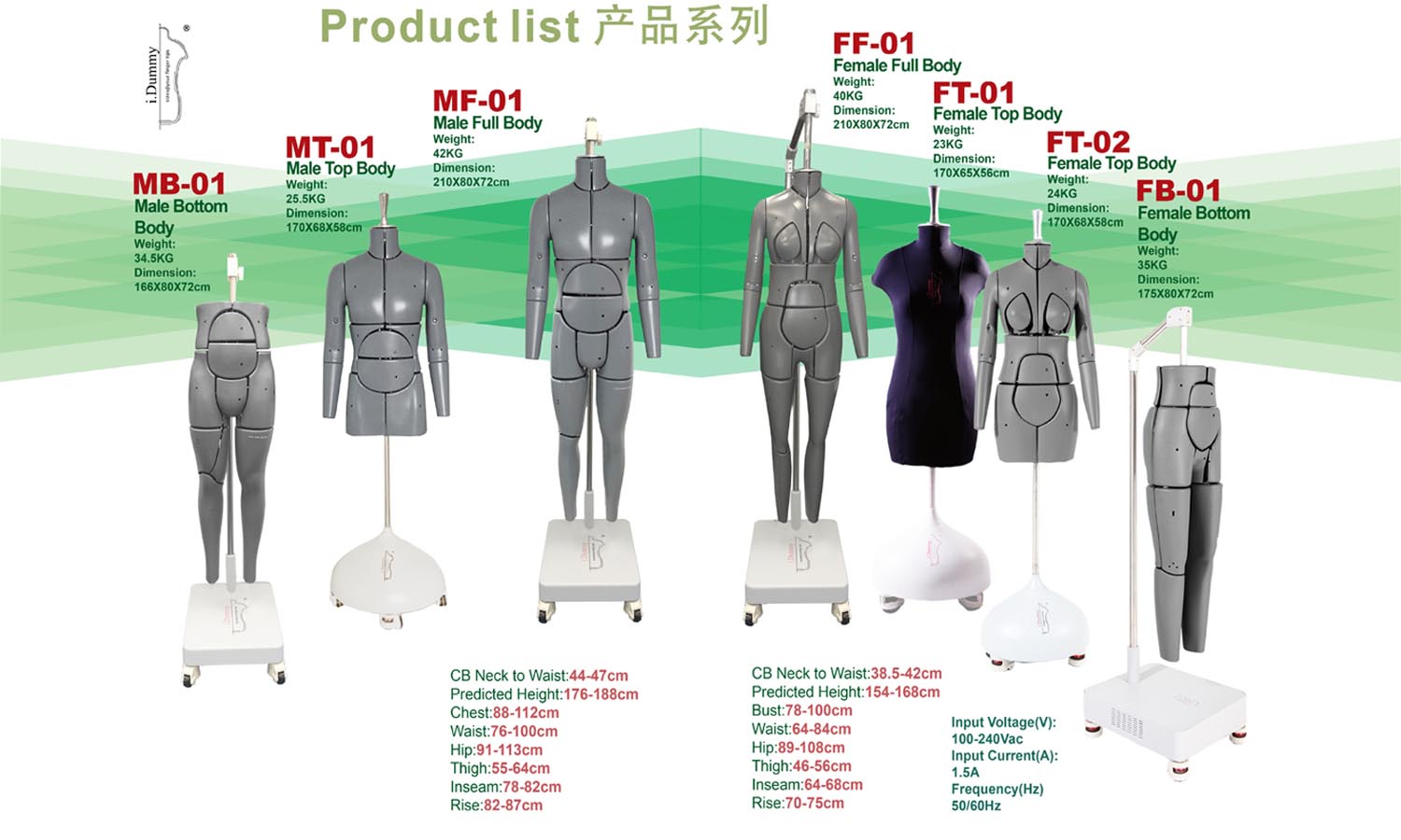 I.DUMMY可以在短短幾秒鐘內,按照需要調整成不同形狀和不同大小的人體模型的體型,尺寸,身高,它可以取代許多尺寸大小不一的假模。