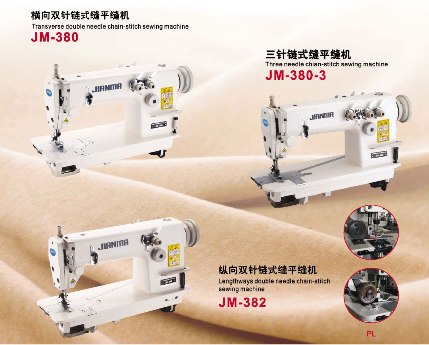 本機是一臺可縫制牛仔褲,便褲,裙子等的棟縫,口袋的卷縫,運動衫的布條裝飾等多種工序的縫紉機。彎針機構采用的是JIANMA獨有的傾斜彎曲一體型的裝置,能發揮優越的耐久性。加固縫(密集縫)是與平縫機相同都可通過返縫拉桿進行操作,可真正的防止脫線。