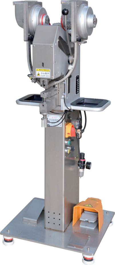 把鈕扣放進對應的2個料斗,開機會自動轉動料斗,自動把鈕扣排滿軌道,自動把鈕扣送到上下模具,何服電機驅動,只要踩下踏腳開關便可裝訂自如,簡單易用。更換配件可平裝訂其它鈕扣。