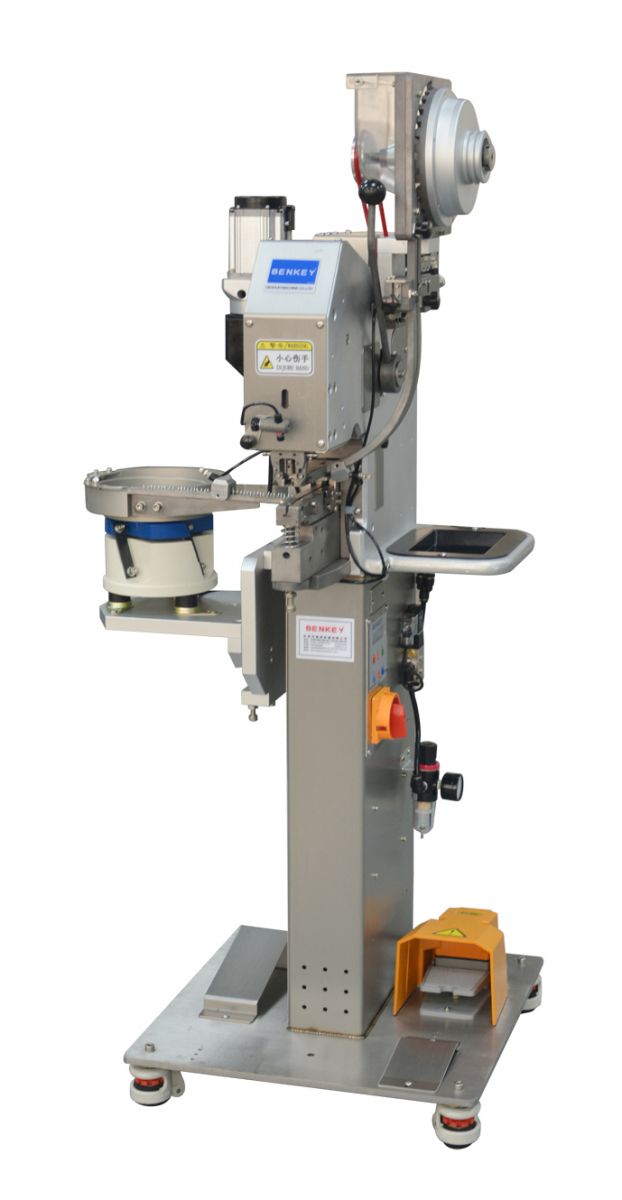 把鈕扣放進對應的2個料斗,開機會自動轉動料斗,自動把鈕扣排滿軌道,自動把鈕扣送到上下模具,伺服電機驅動,只要踩下晴腳開關便可裝訂自如,簡單易用。更換配件可以裝訂其它鈕扣。