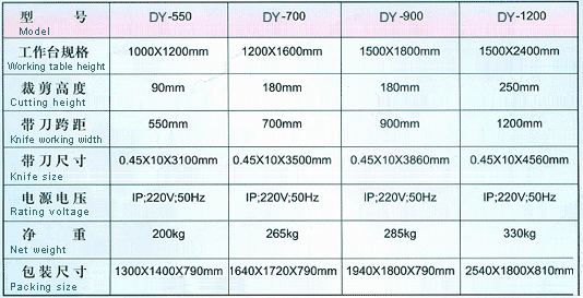 帶狀式裁剪機是各制衣,針織等行業的主要設備,可用于裁剪各類針織物,適用于大小范圍裁剪。DY系列帶狀式裁剪機A型號為有氣墊機型。B型為變頻機型,后面無字母為無氣墊機型。