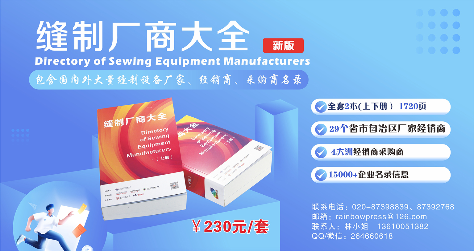 另外,公司聯(lián)合廣東省縫制設(shè)備商會(huì)等單位出版了行業(yè)信息量最大的企業(yè)名錄--《縫制廠商大全》。《縫制廠商 大全》分為上、下冊(cè),共收錄了全國(guó)各省、市及港臺(tái)地區(qū)縫制設(shè)備生產(chǎn)企業(yè)及經(jīng)銷代理商名錄資料近8200家;另 外還收錄了亞洲各國(guó)縫制設(shè)備采購(gòu)商資料近1200家,南美、北美、歐洲、非洲及大洋洲縫制設(shè)備采購(gòu)商資料1200 多家。中國(guó)縫制機(jī)械協(xié)會(huì)理事長(zhǎng)田民裕為《縫制廠商大全》題序,序中提到:“《縫制廠商大全》的出版將是我 國(guó)縫制機(jī)械行業(yè)信息查詢工具多元化發(fā)展的又一補(bǔ)充,也填補(bǔ)了縫制設(shè)備行業(yè)黃頁(yè)類工具書(shū)籍的空白。《縫制廠商大全》涵蓋了國(guó)內(nèi)外各地的縫制設(shè)備廠商及采購(gòu)商名錄,其內(nèi)容全面、信息完整,是人們查閱、了解國(guó)內(nèi)外各地區(qū)行業(yè)廠商的重要工具書(shū)籍。”